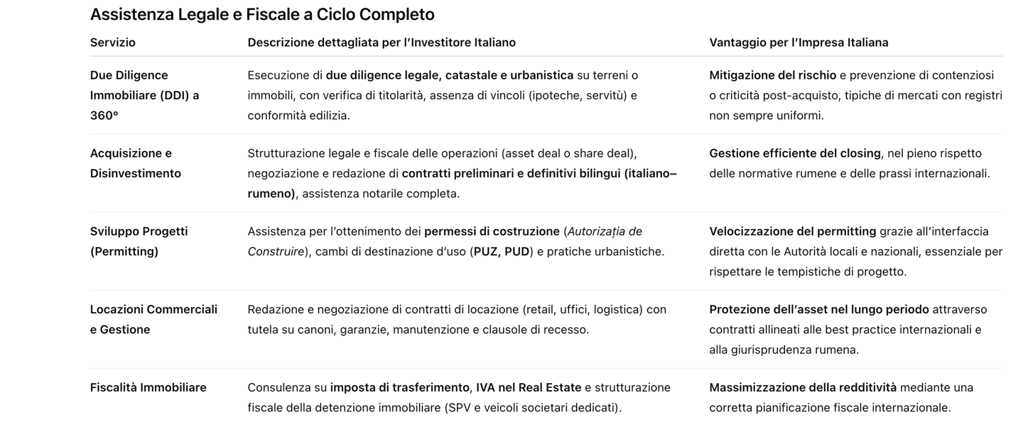 Il settore immobiliare rumeno continua (dall’inizio degli anni 2000 è il settore per eccellenza del mercato immobiliare europeo) a offrire opportunità significative per gli investitori italiani, sia nel comparto commerciale, industriale/logistico che in quello residenziale di fascia di fascia media e soprattutto alta. La nostra consulenza copre l'intero ciclo di vita dell'investimento.